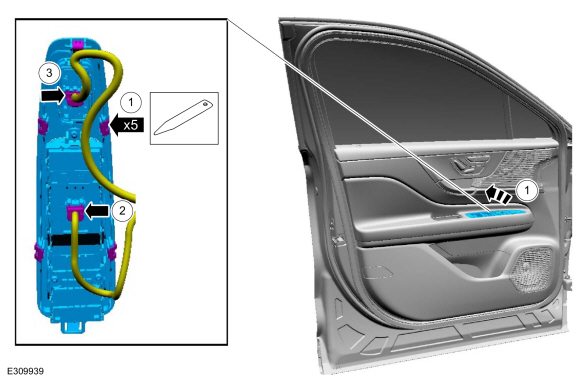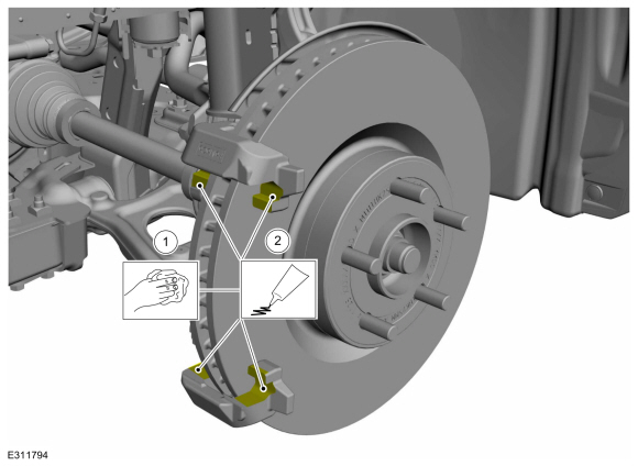 NOTICE: Brake pads with adhesive on the insulator are one-time use only. When the brake pads are separated from the brake caliper, new brake pads must be installed to prevent brake noise and shudder.
